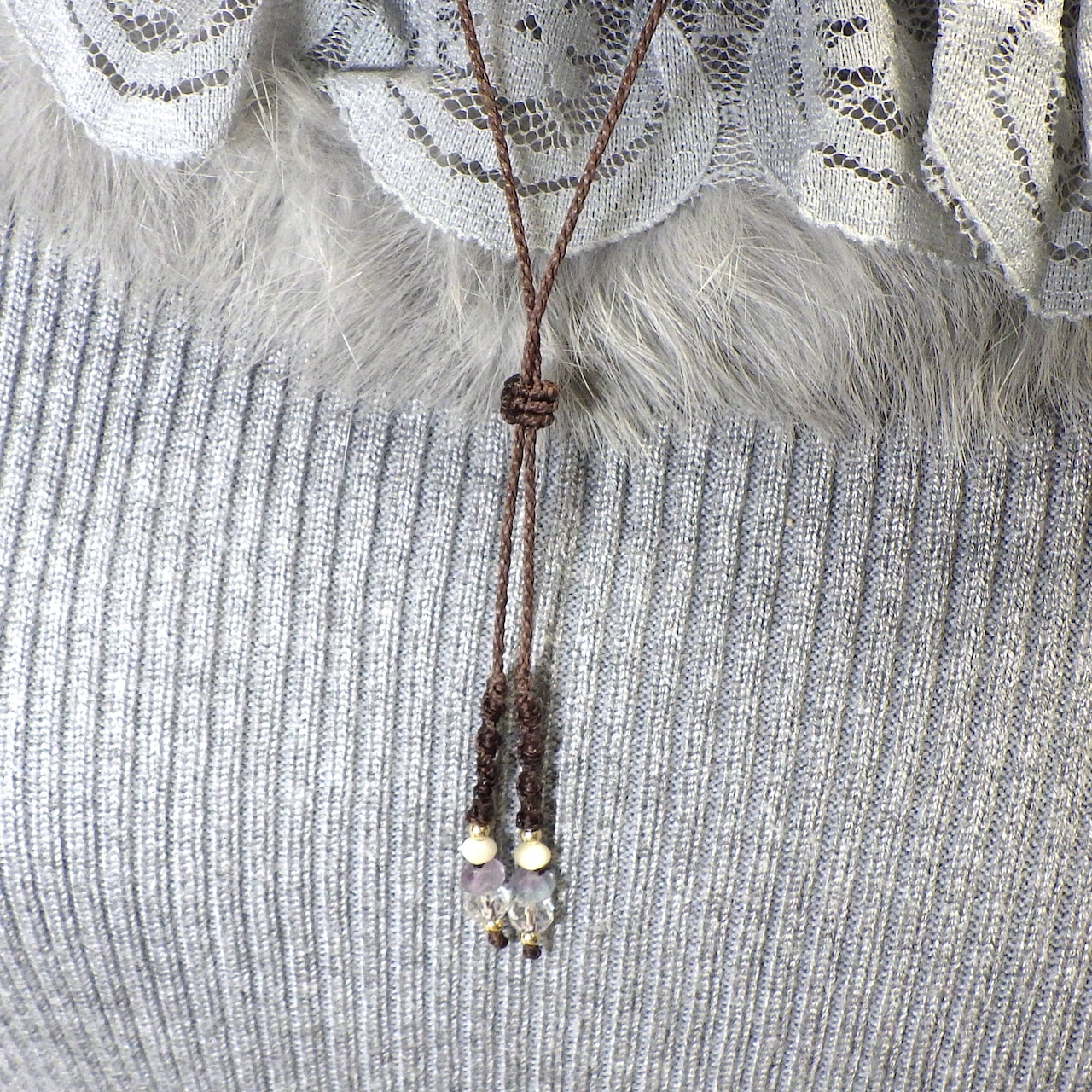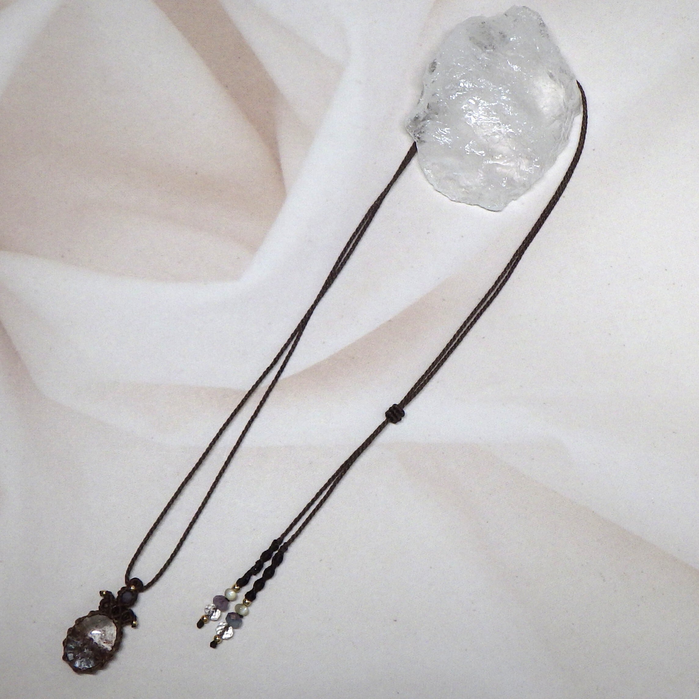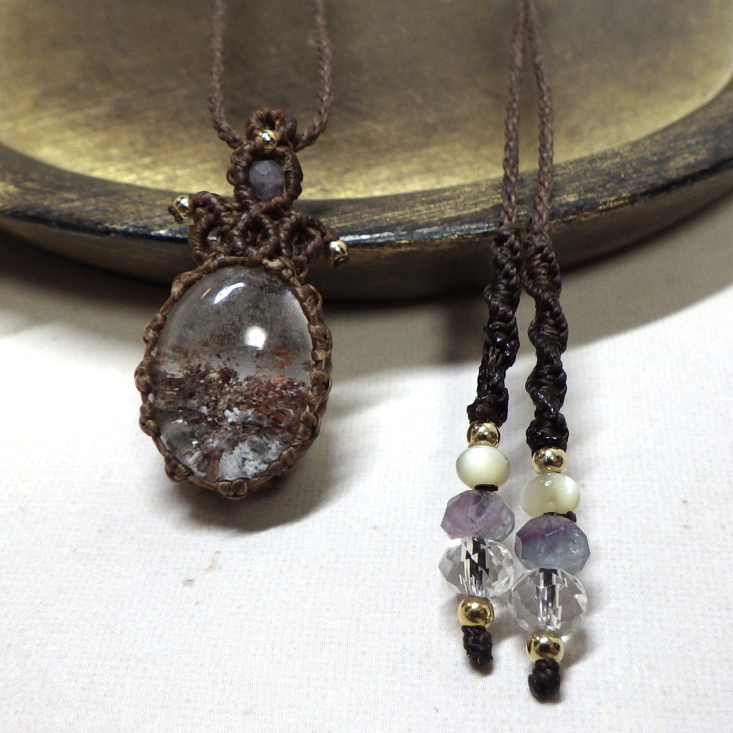 〈使用材料〉ブラジル「Linhasita社」製のワックスコード、天然石(ガーデンクォーツ、フローライト、マザーオブパール、水晶)、メタルビーズ等。