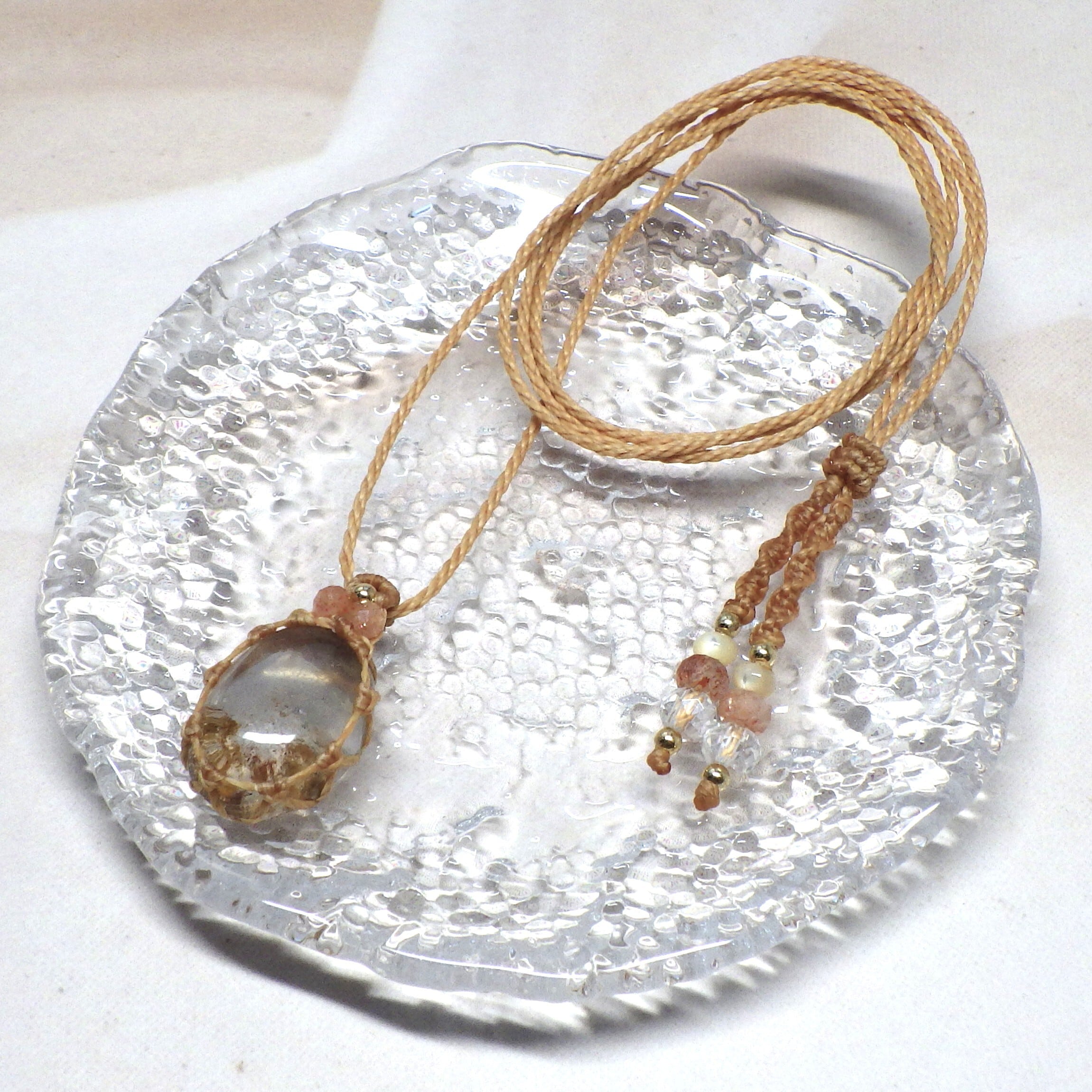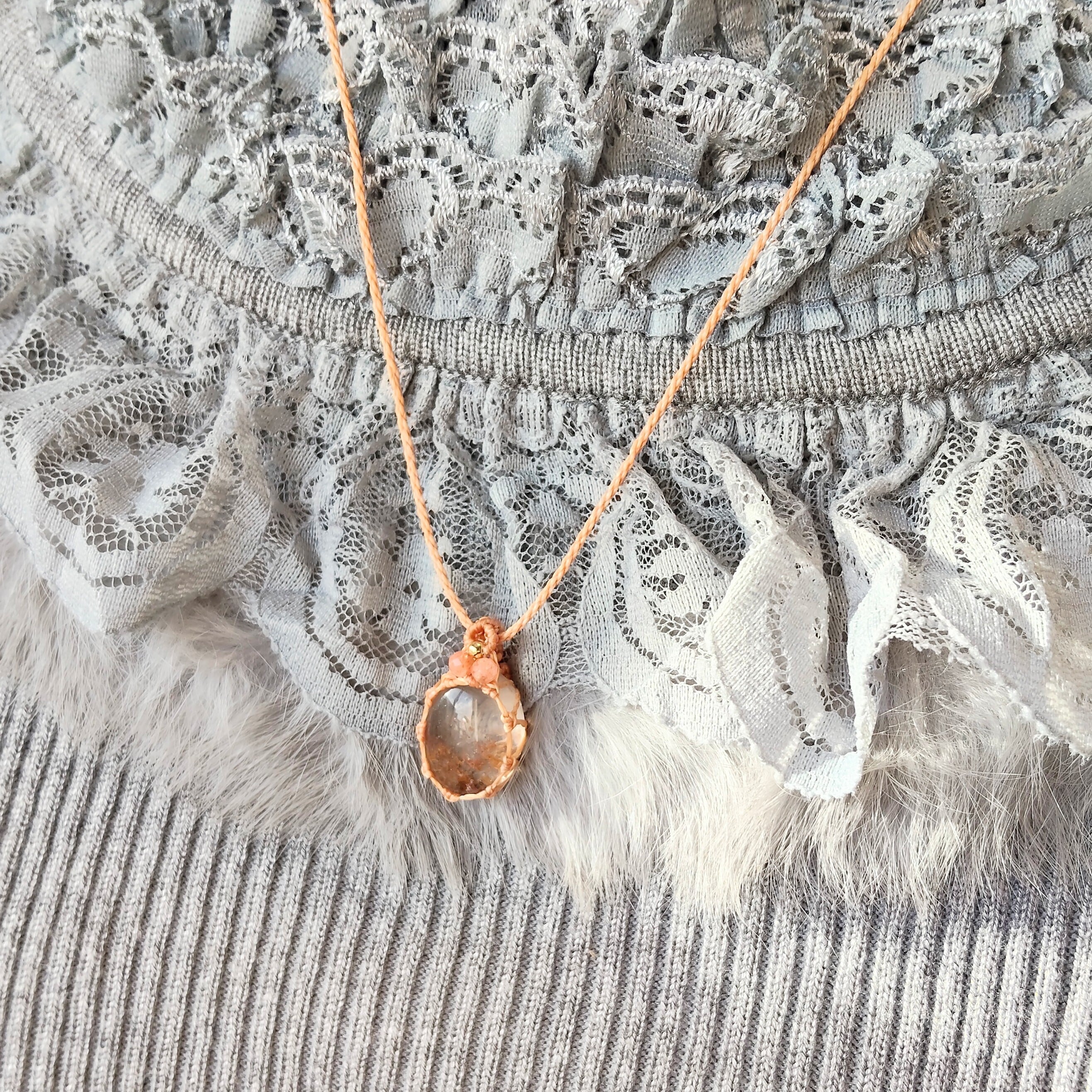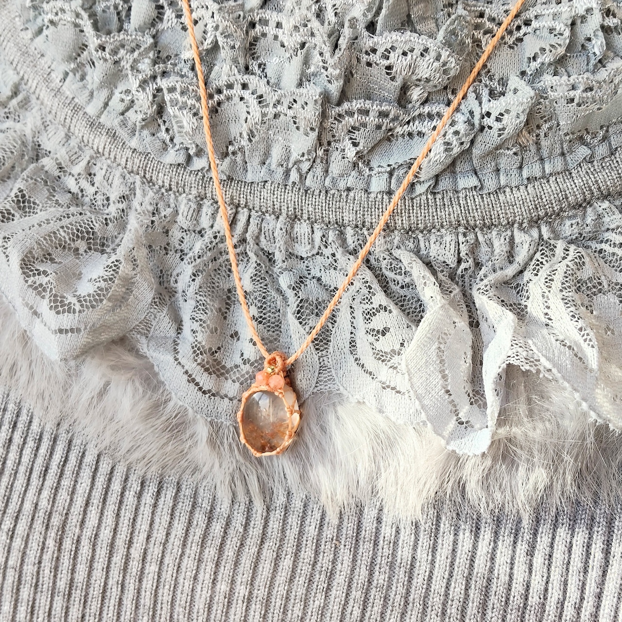 ガーデンクォーツを透かし編みでフレーミングした、ナチュラルで可愛いペンダントネックレスです。