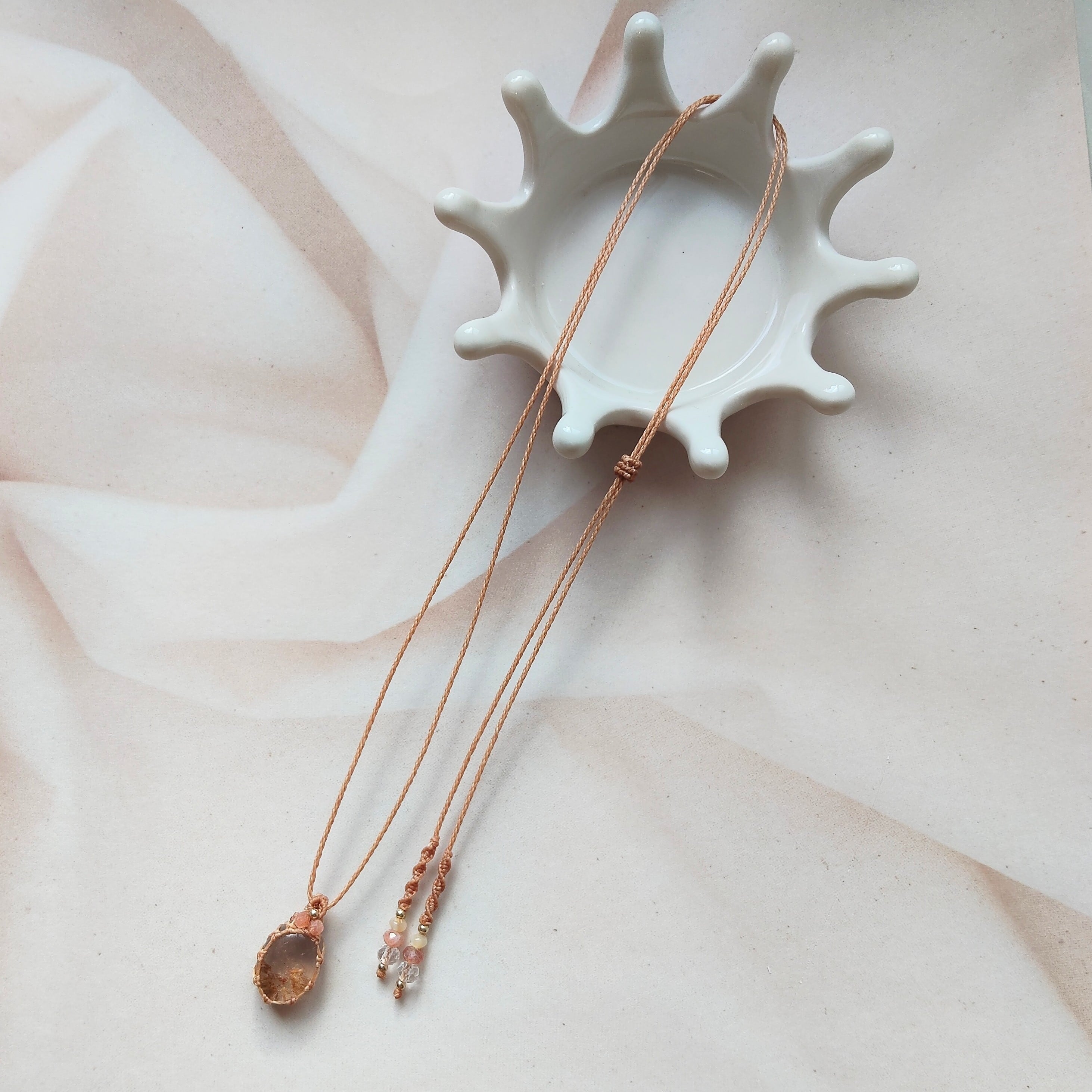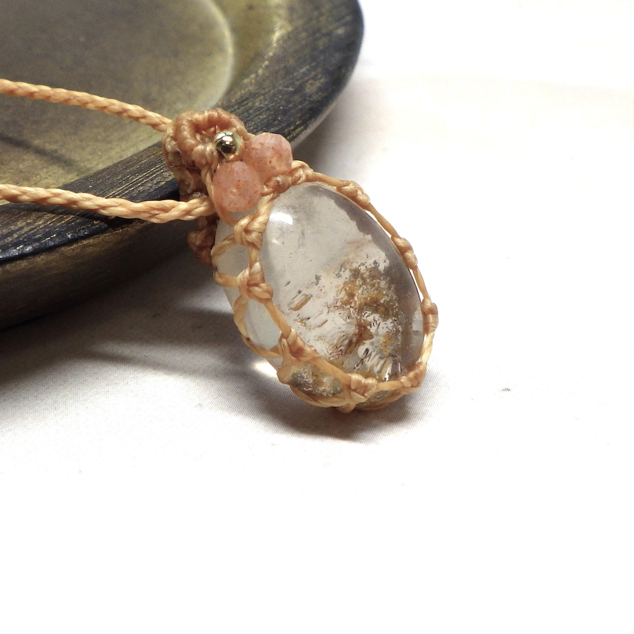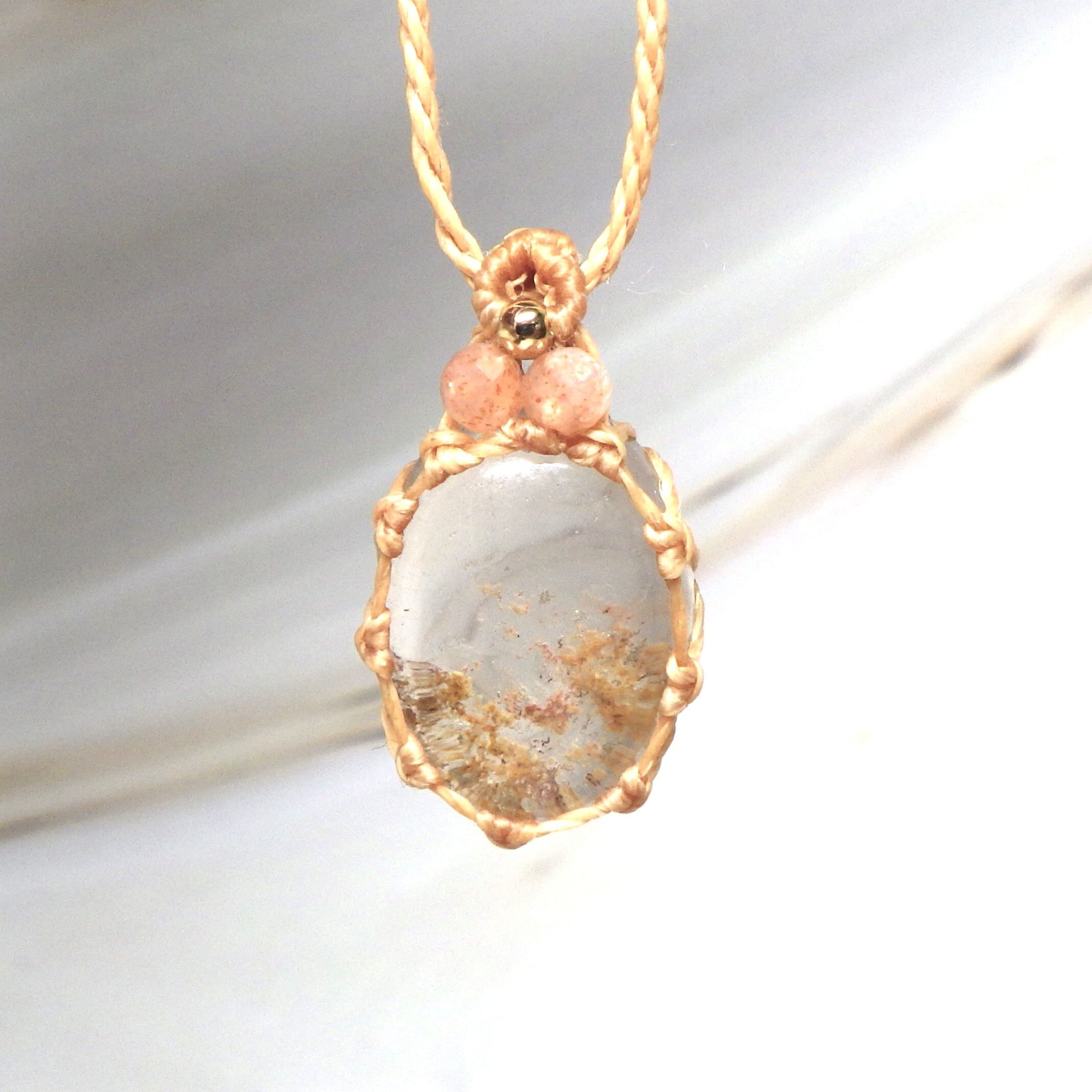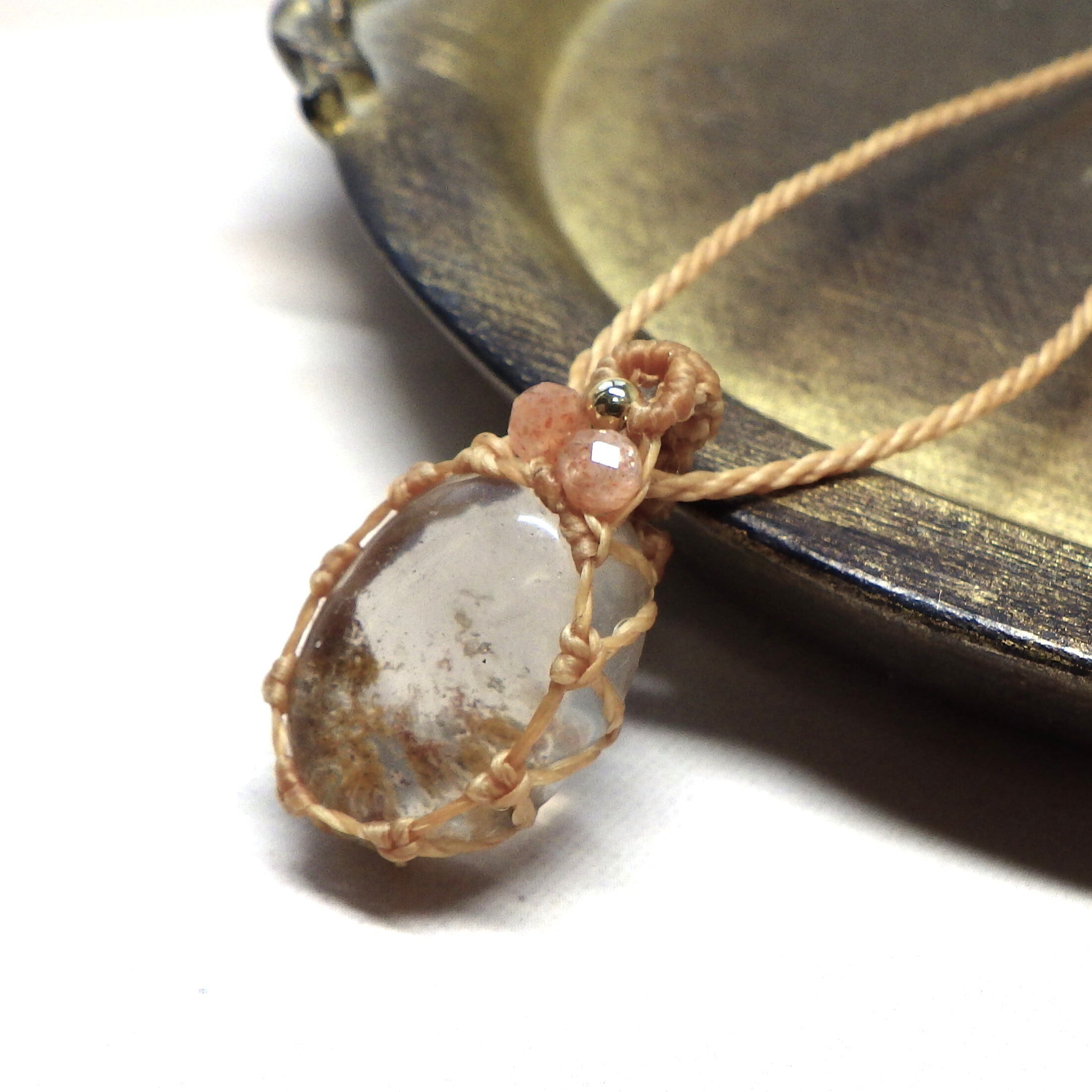 ガーデンクォーツを透かし編みでフレーミングした、ナチュラルで可愛いペンダントネックレスです。