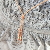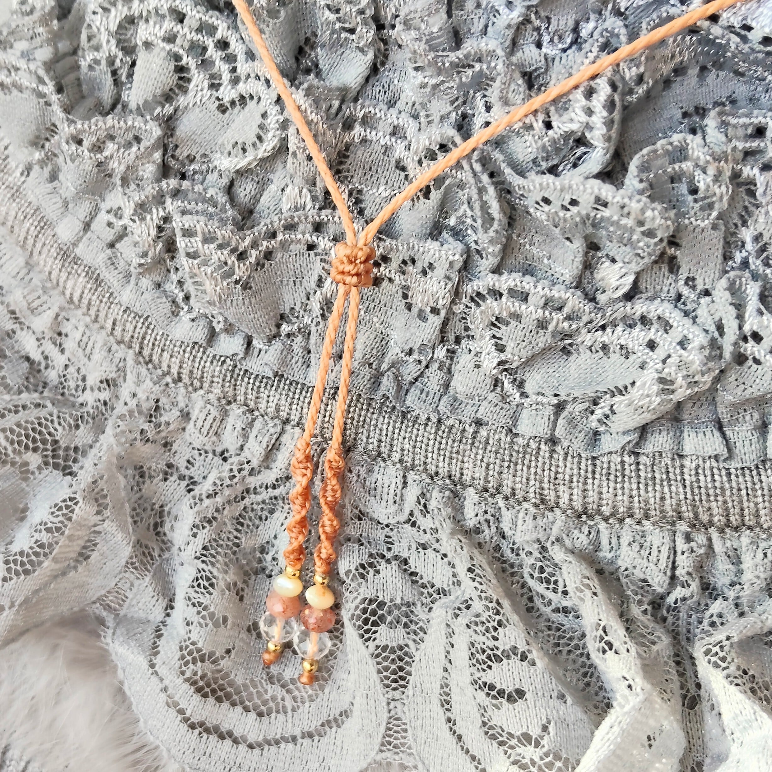 〈使用材料〉ブラジル「Linhasita社」製のワックスコード、天然石、メタルビーズ等。