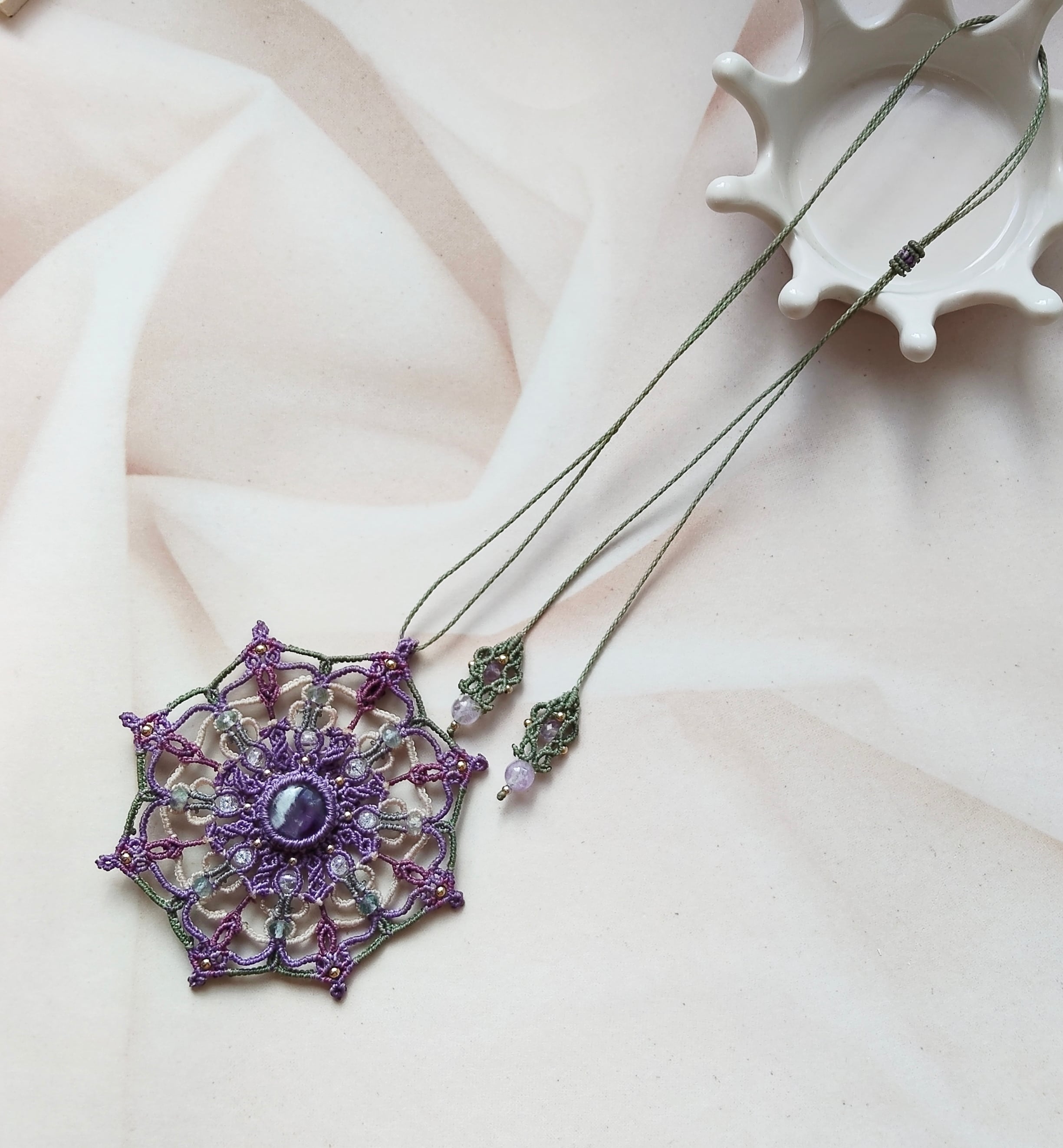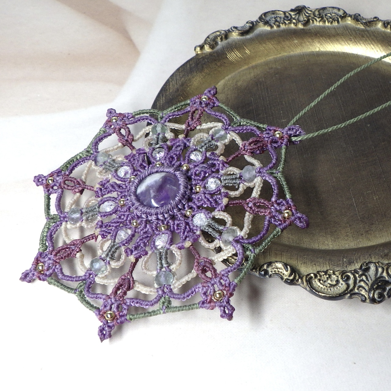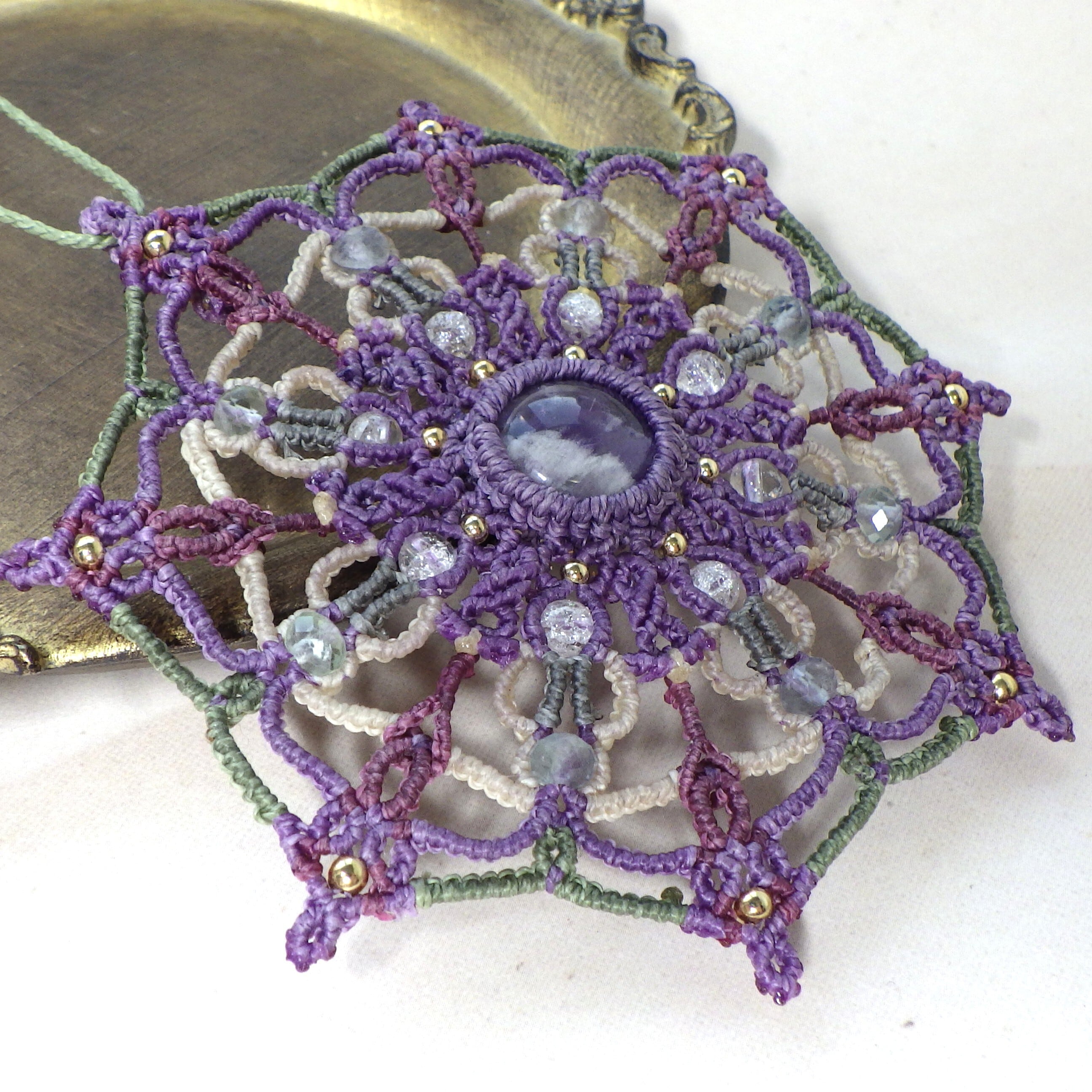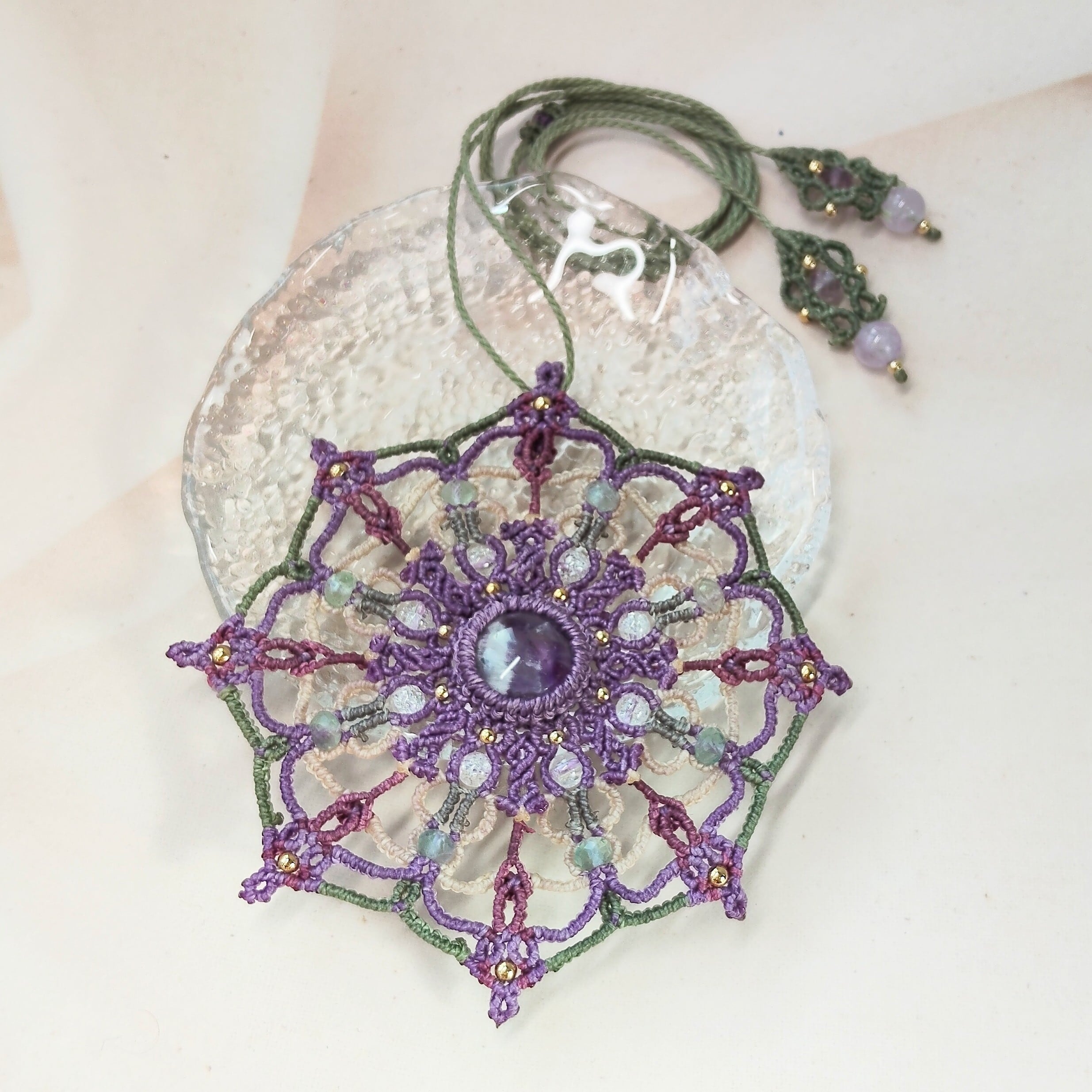 色とりどりのコードで描かれた花模様の曼荼羅ペンダントは、まるで小宇宙を切り取ったかのよう。