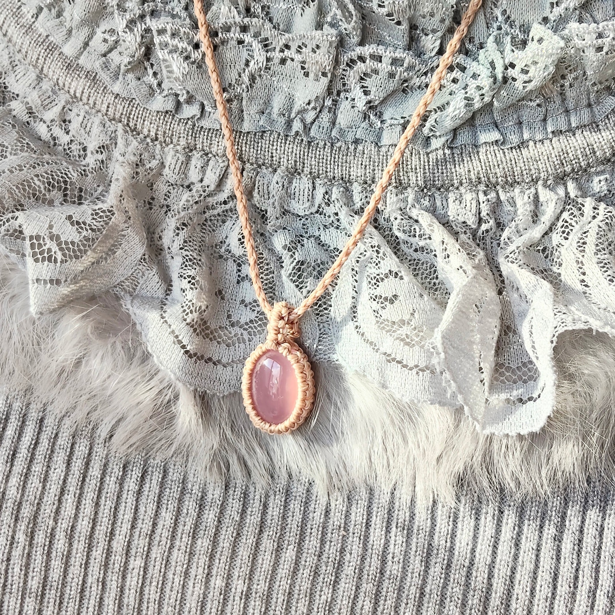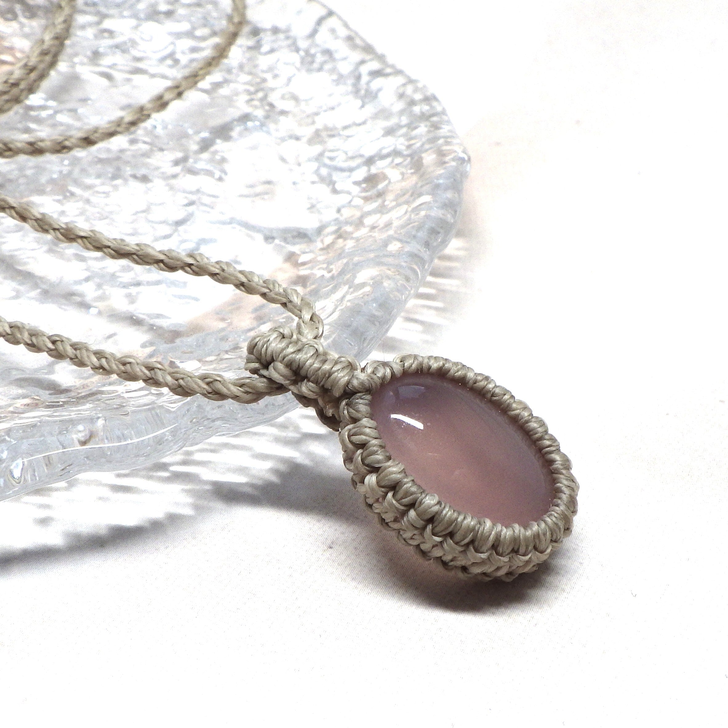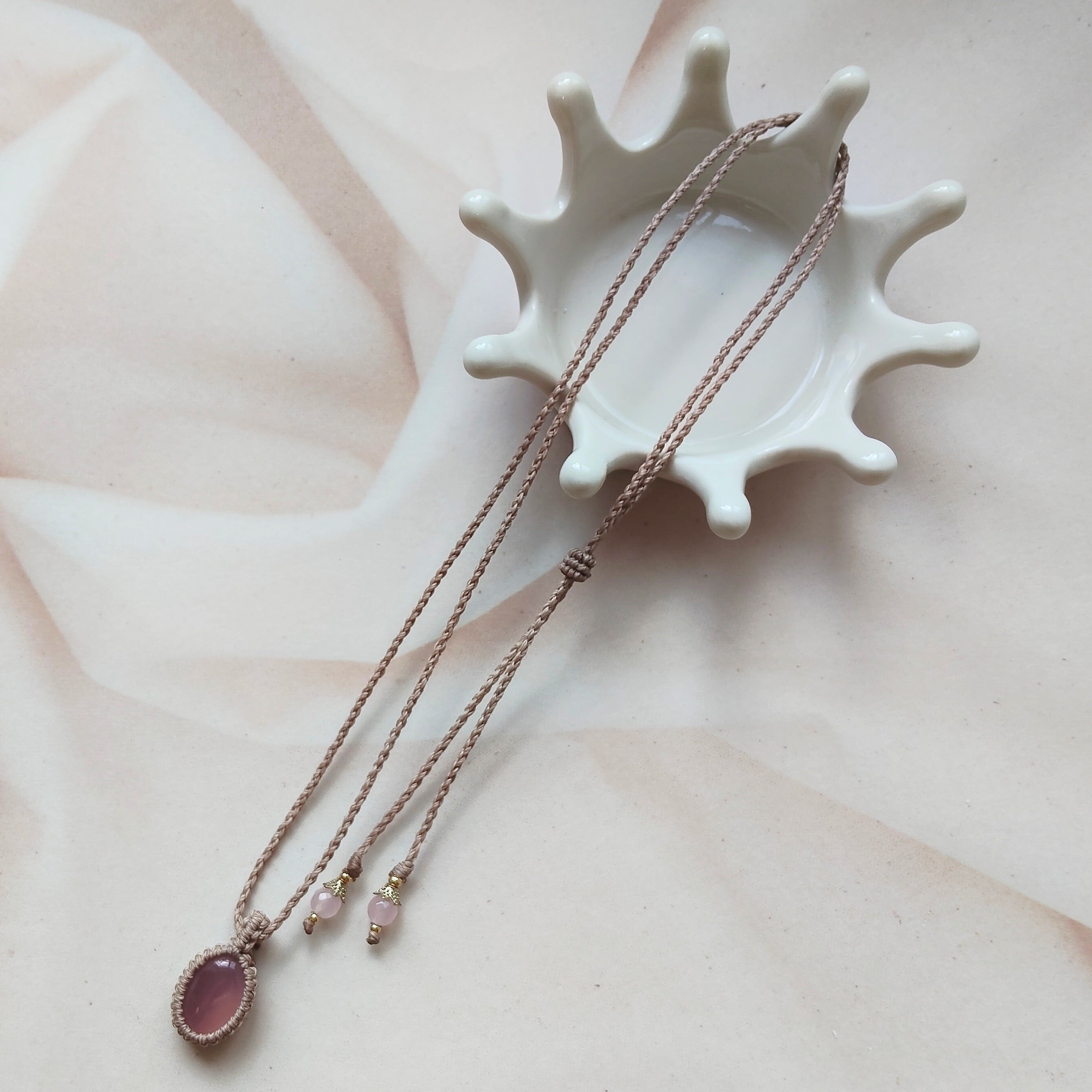 ぷるんとした愛らしいピンクのカルセドニーを、ベージュ色のコードでシンプルに編み上げました。