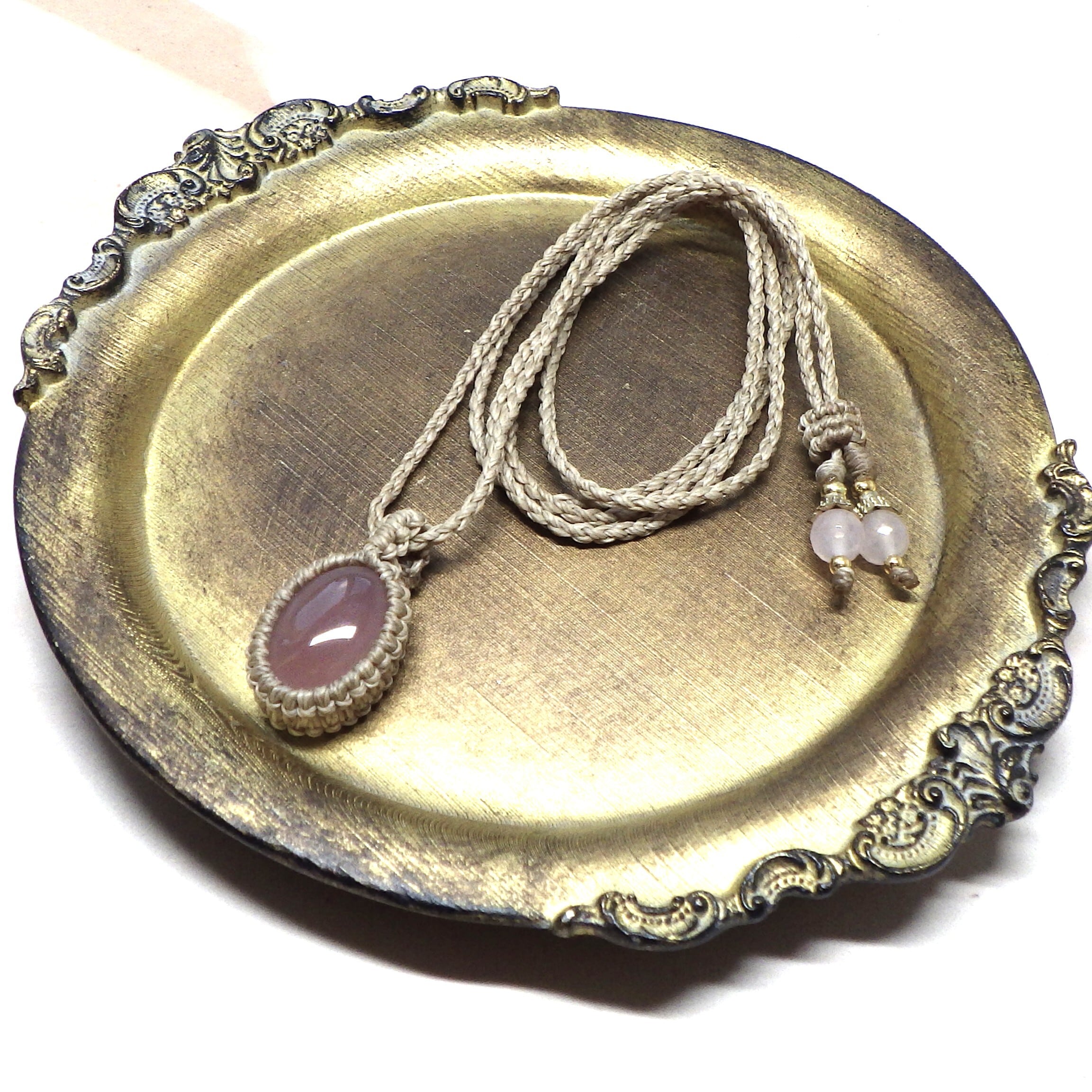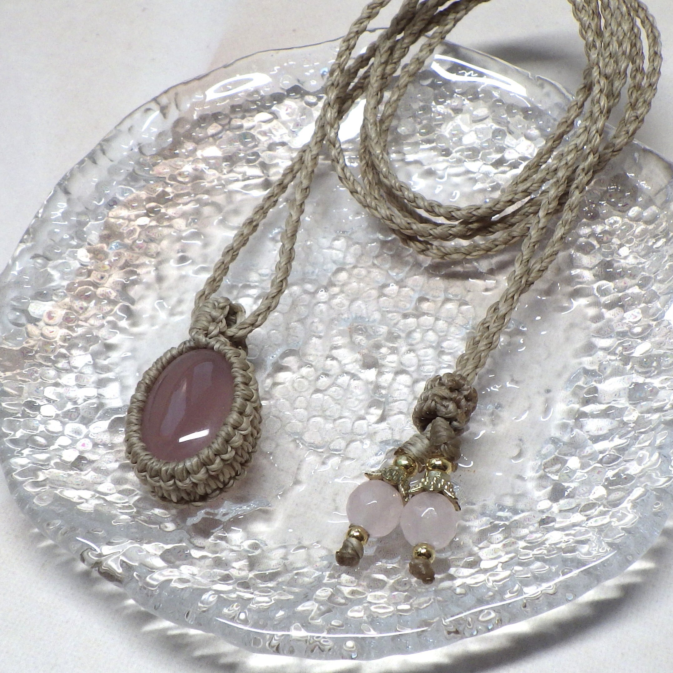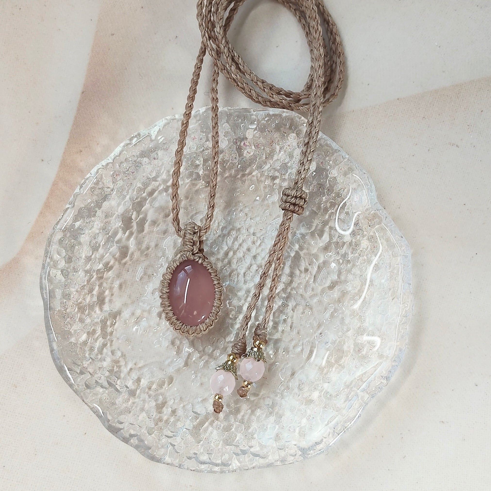 ぷるんとした愛らしいピンクのカルセドニーを、ベージュ色のコードでシンプルに編み上げました。
