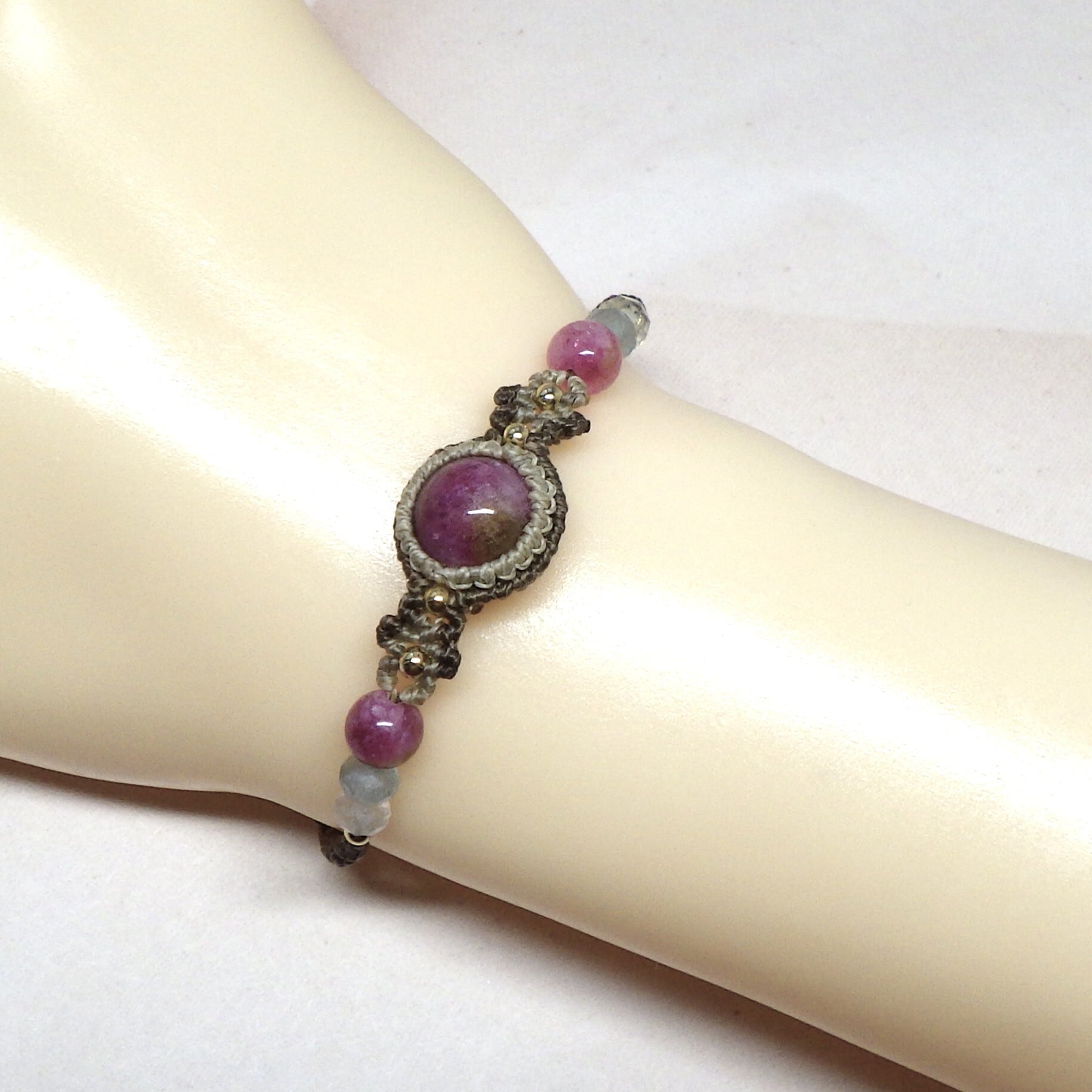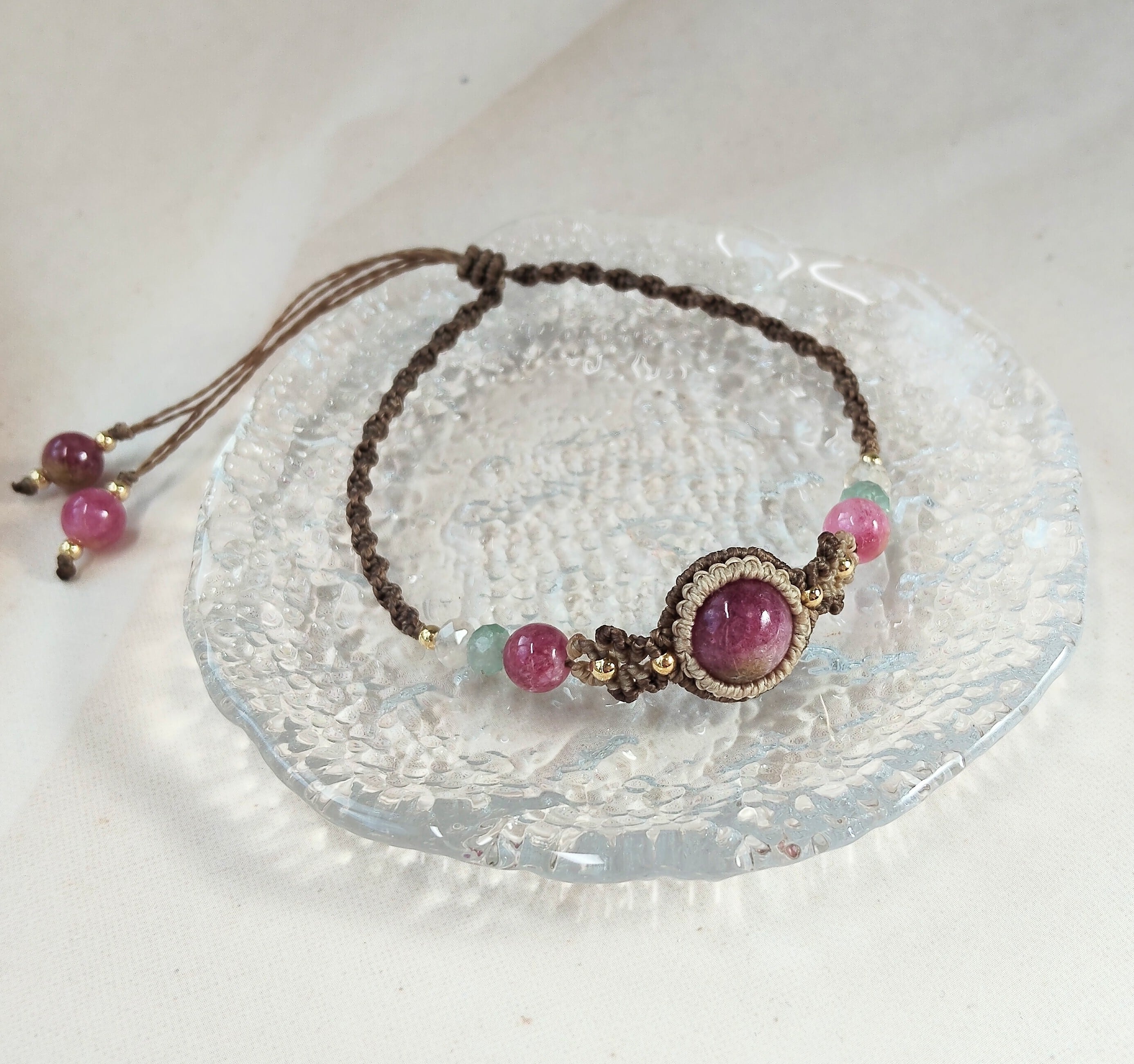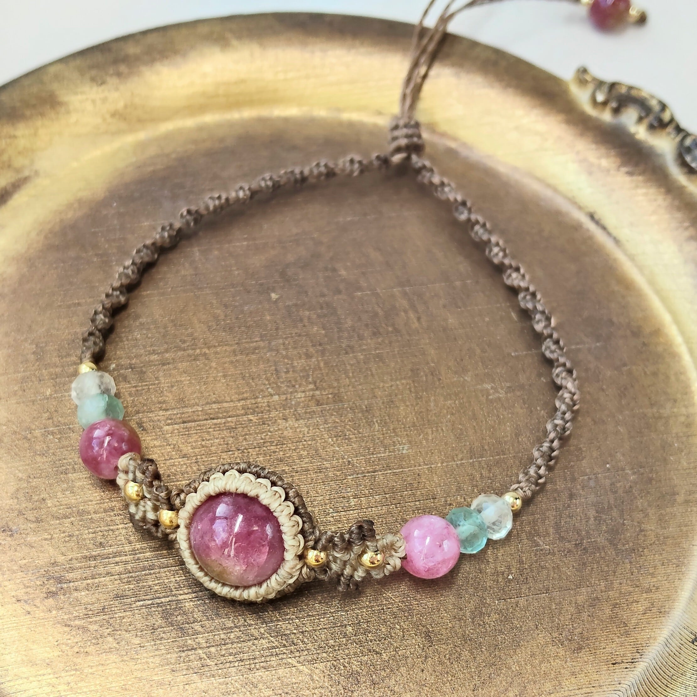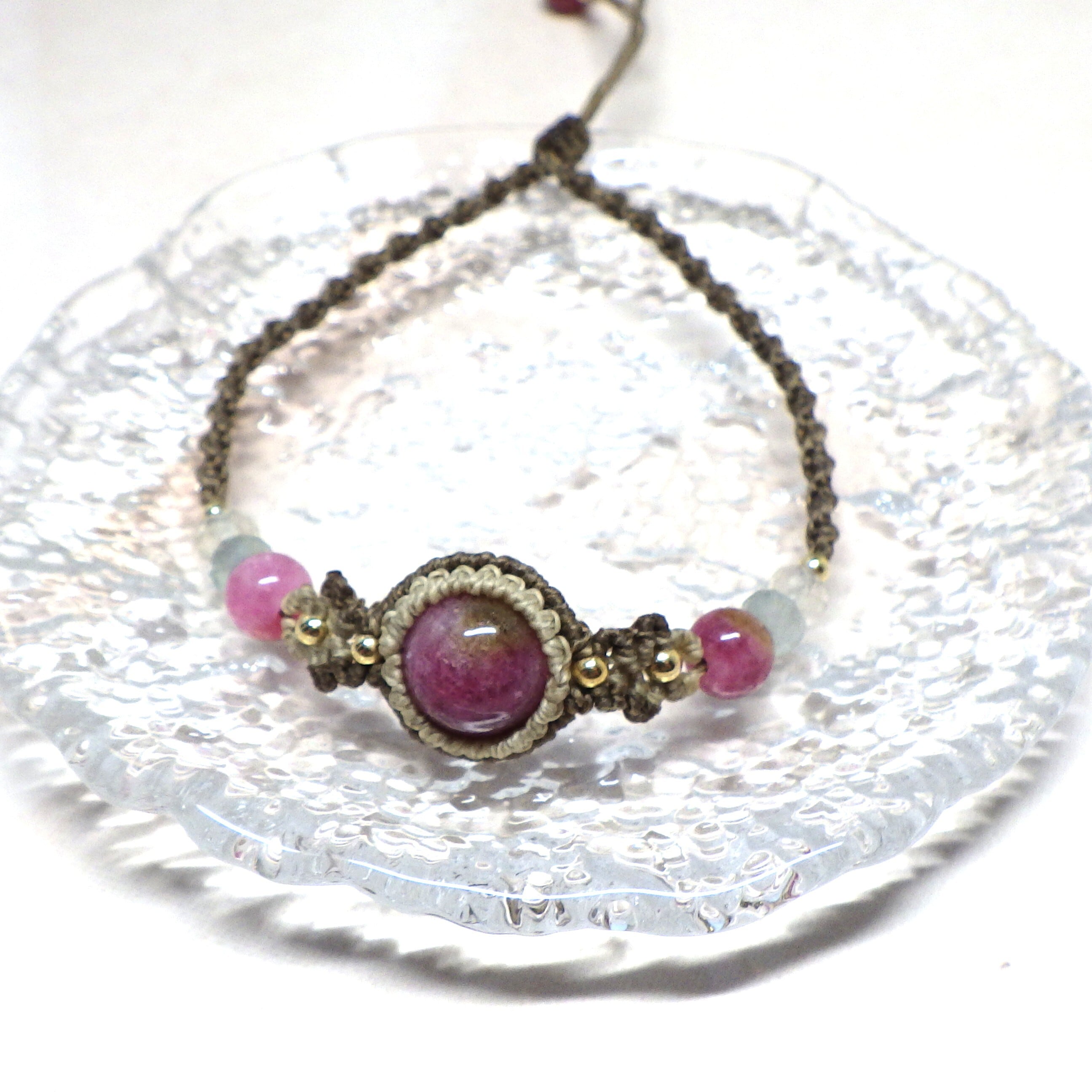 ルビーのような鮮やかなピンクカラーが目を惹く10ミリのトルマリンを中心に、色を合わせたコードやサイドの天然石で楽しいイメージに仕上げました。自然が生み出す美しい色彩を、日常の中で楽しむことができますように。