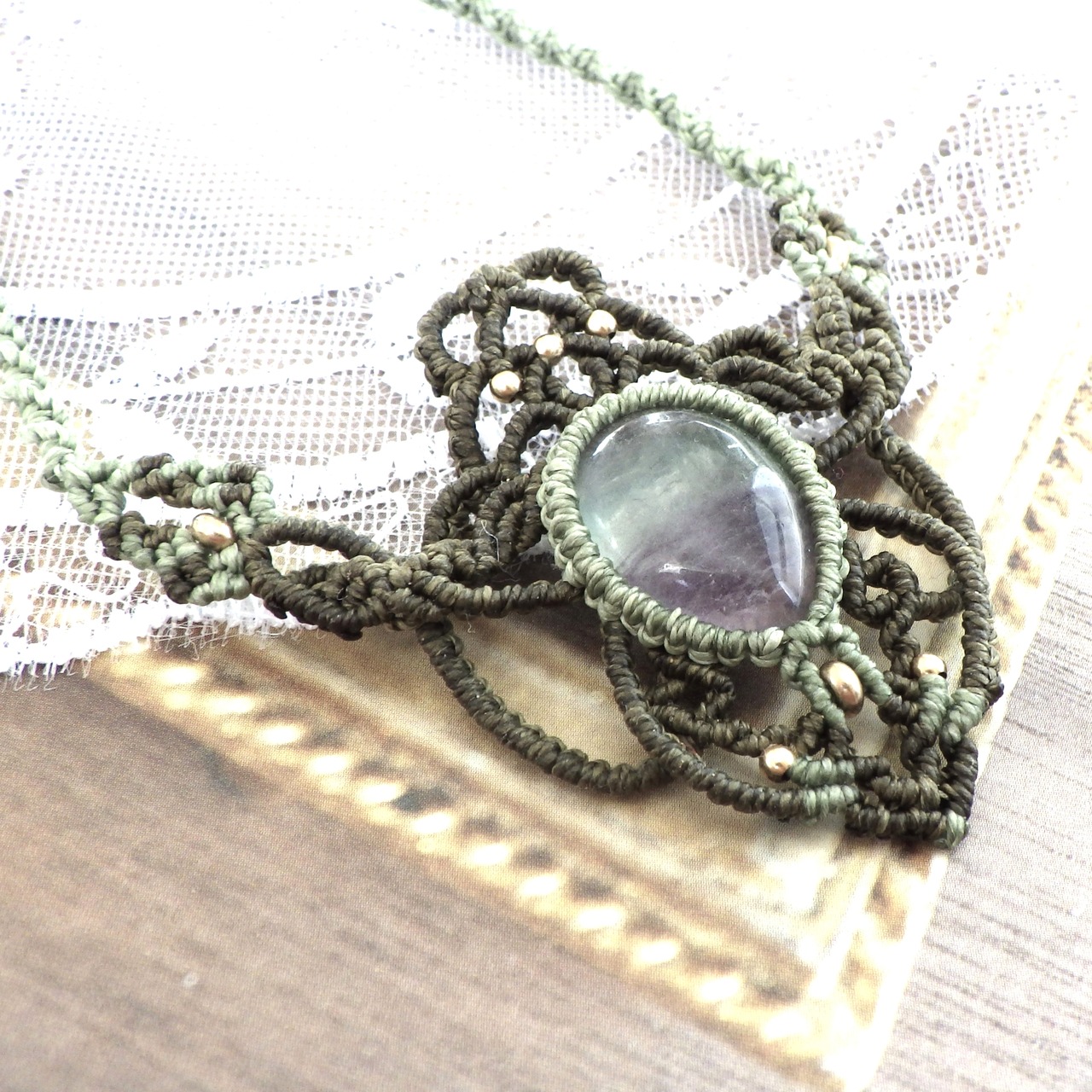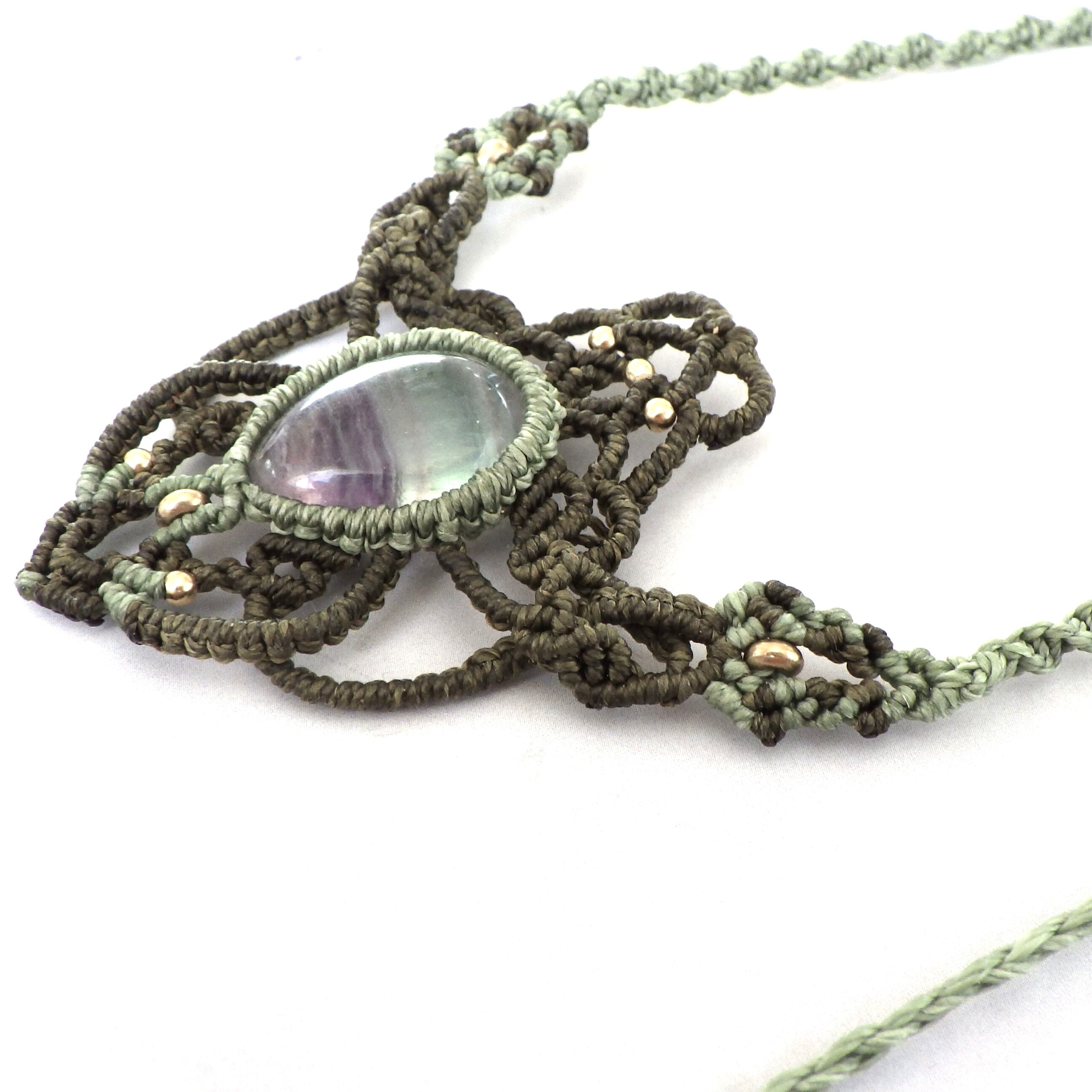 フローライトを2色のグリーンのコードで豪華にフレーミングした素敵なデザインのネックレスです。
