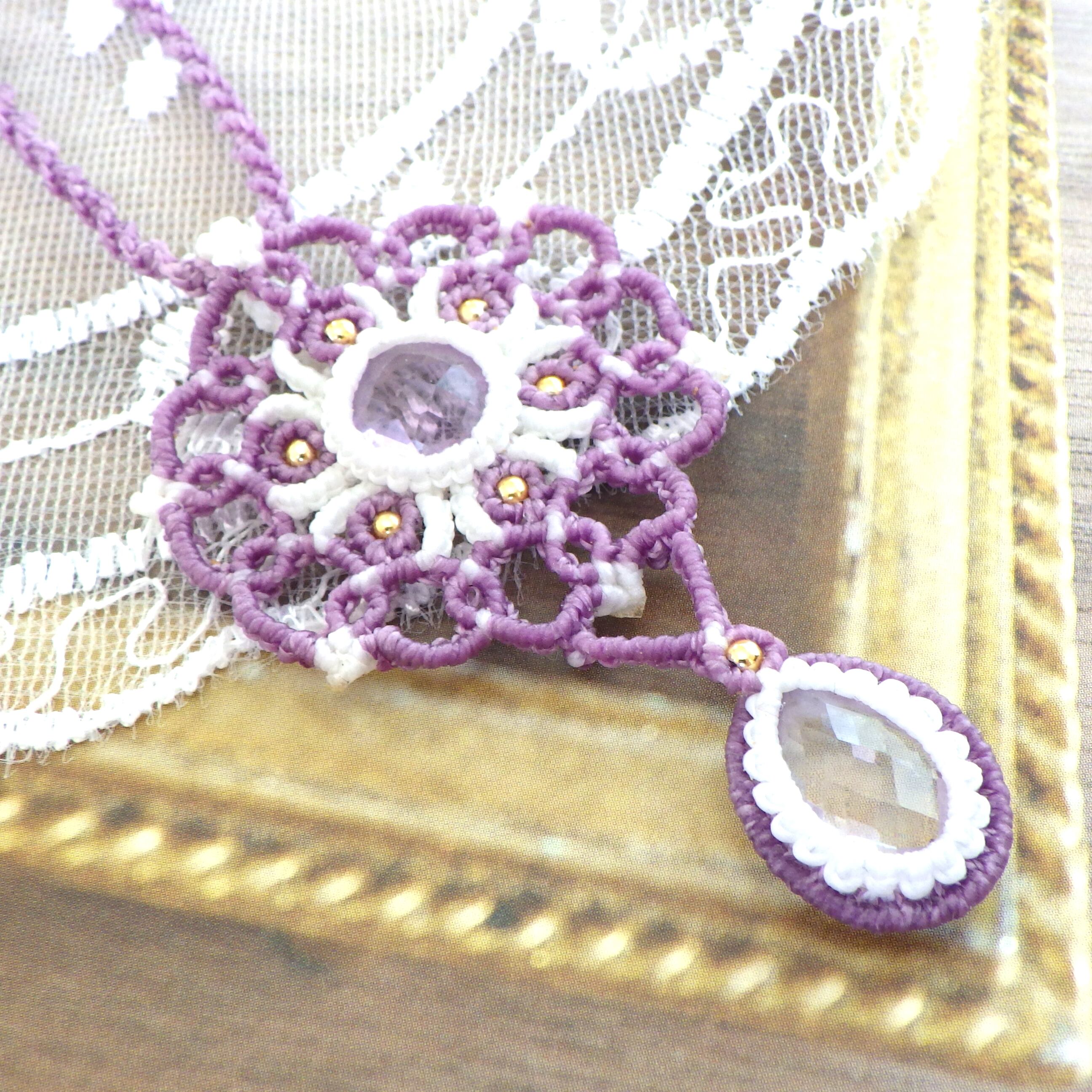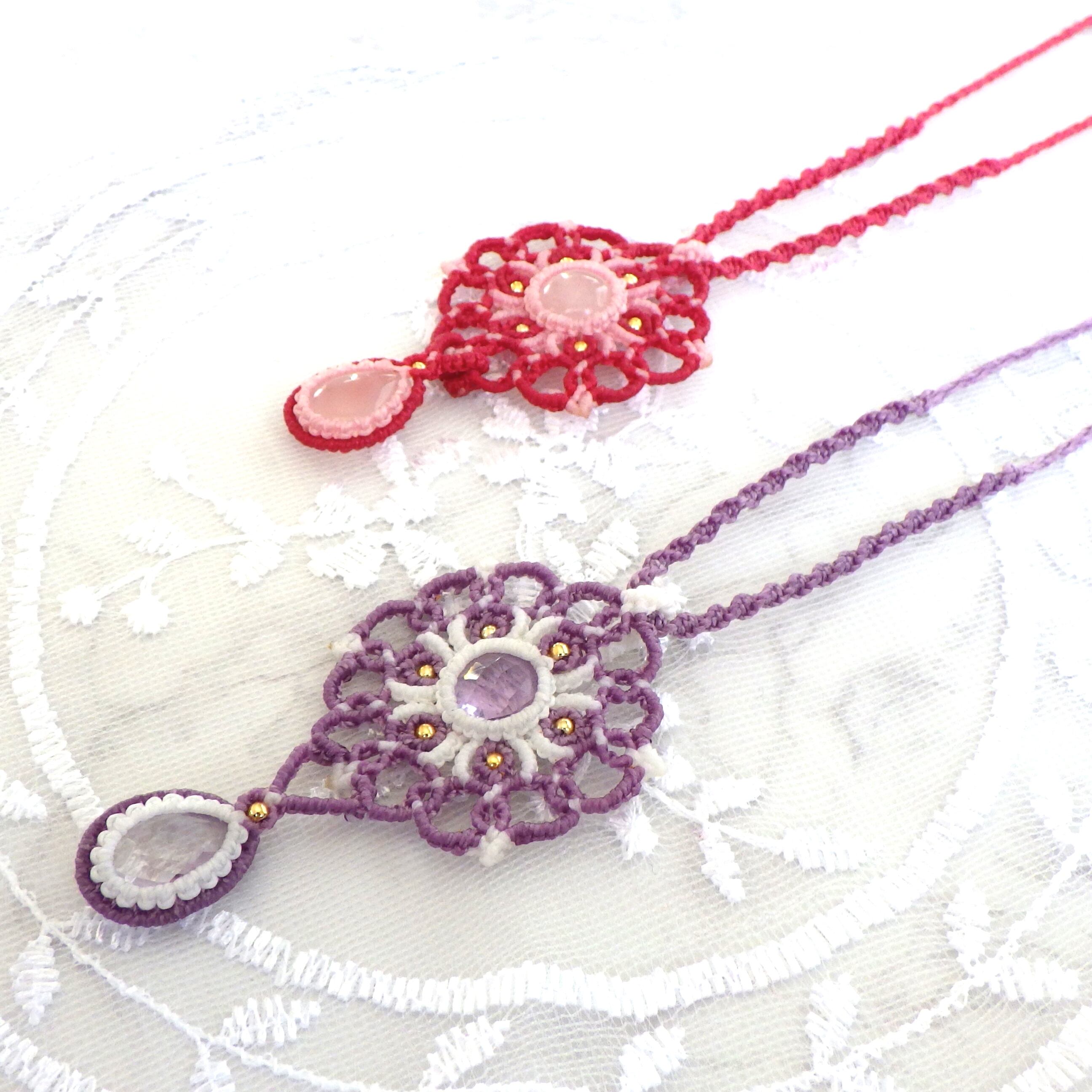 ピンクアメジストのマクラメネックレス「fluffy flower」