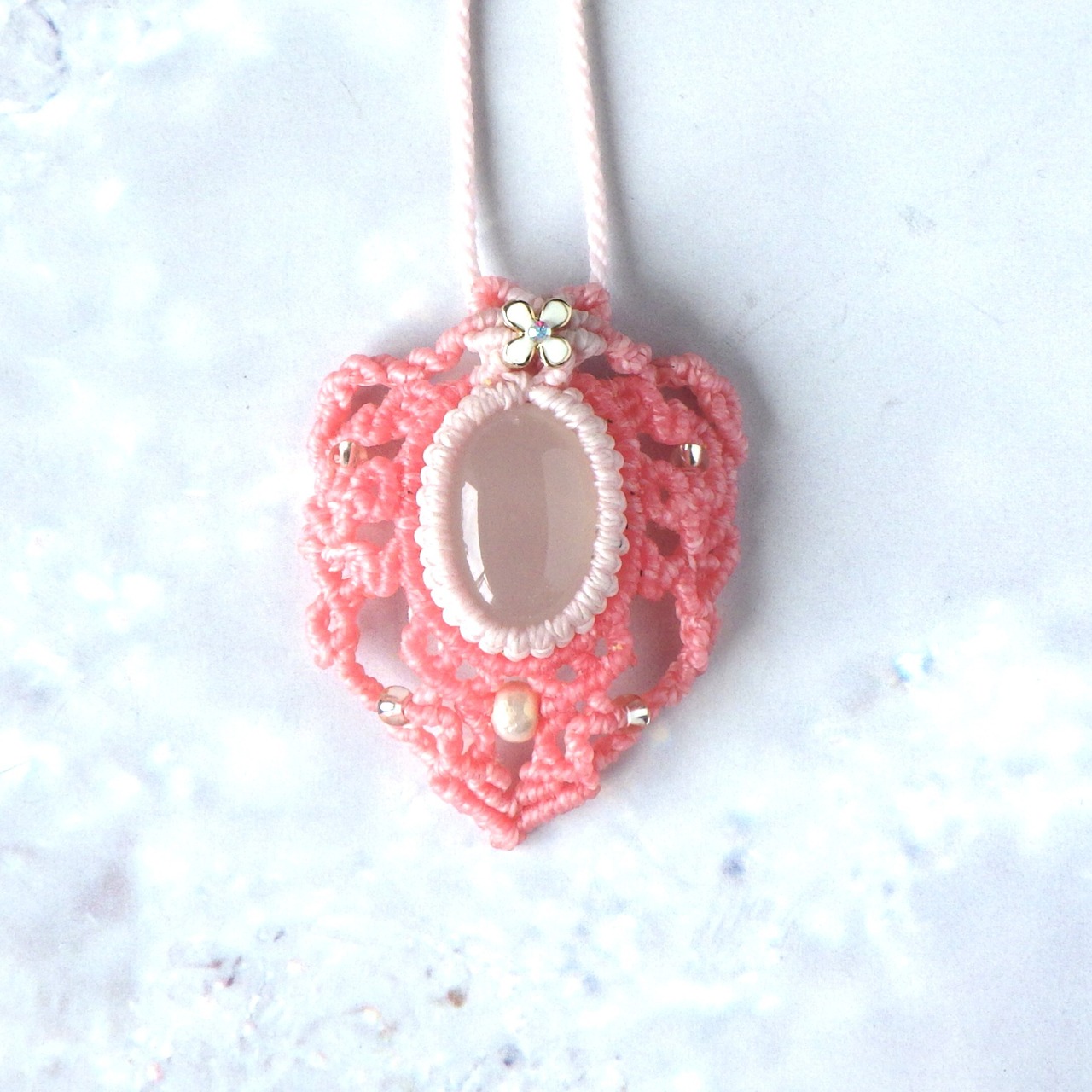 カルセドニーを包んでいるコードと首ひも部分は淡いピンク。レース模様に見えるトップ部分はオレンジに近いサーモンピンク。