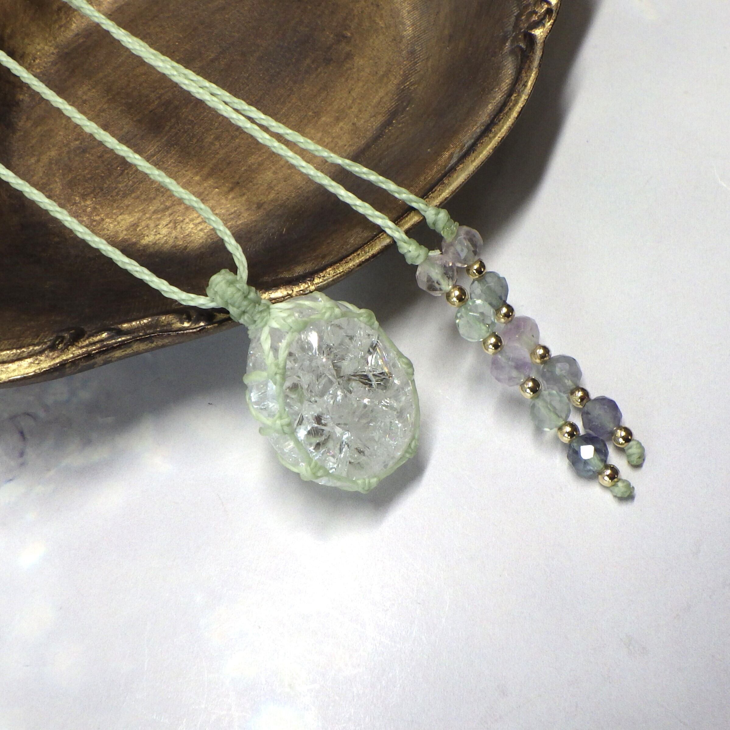 クラック水晶を透かし編みでフレーミングしたナチュラルで可愛いペンダントネックレスです。