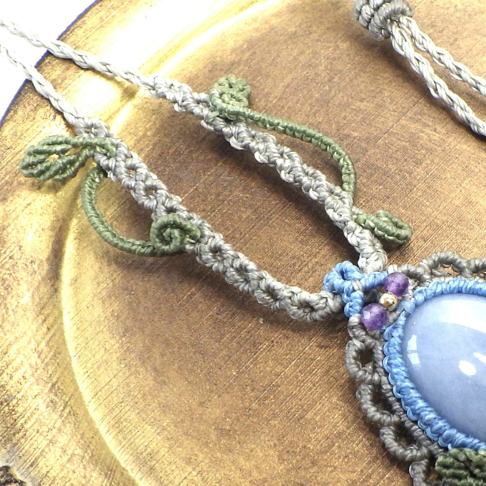 またフレーム上部にはアクセントに小さな天然石(アメジスト)を編み込みました。