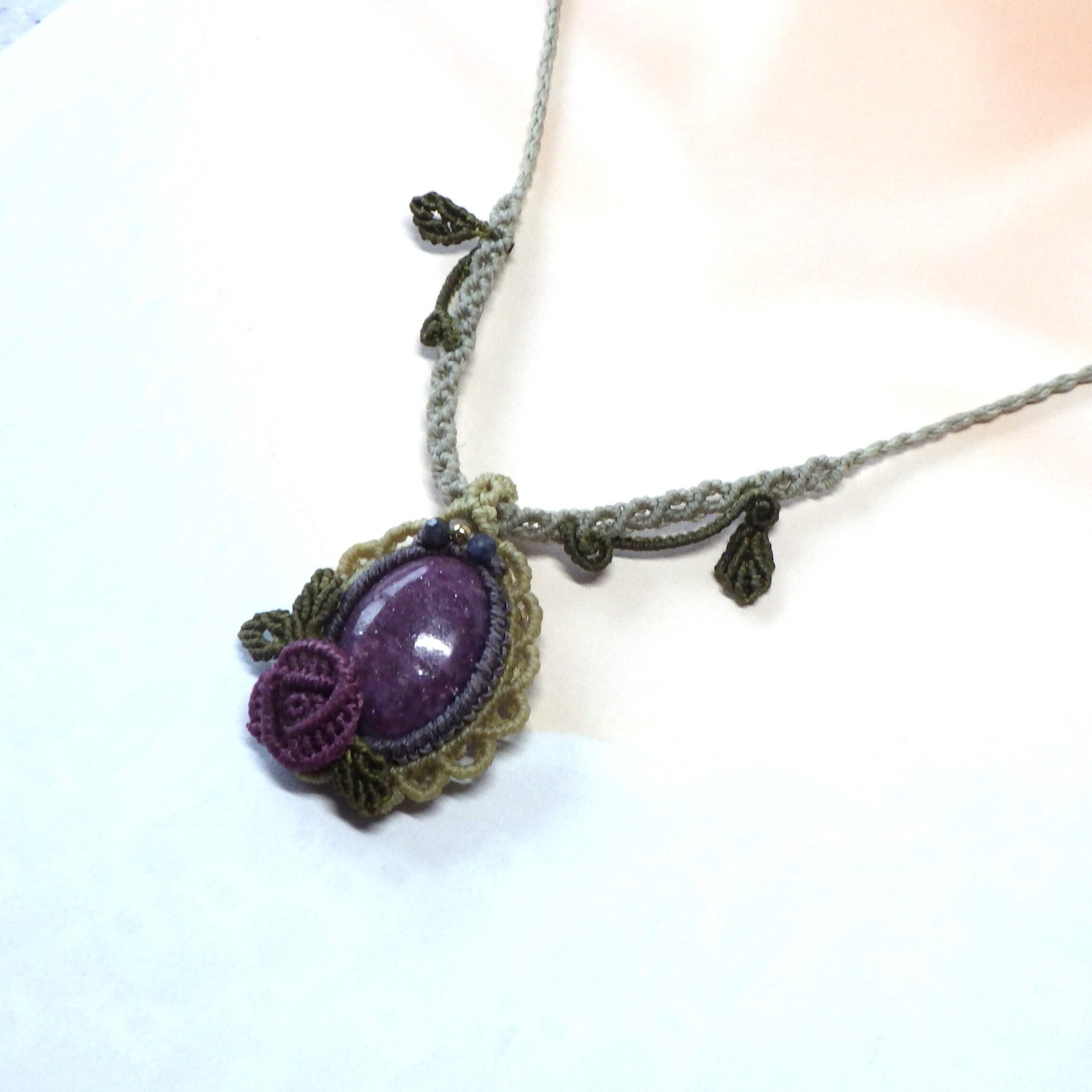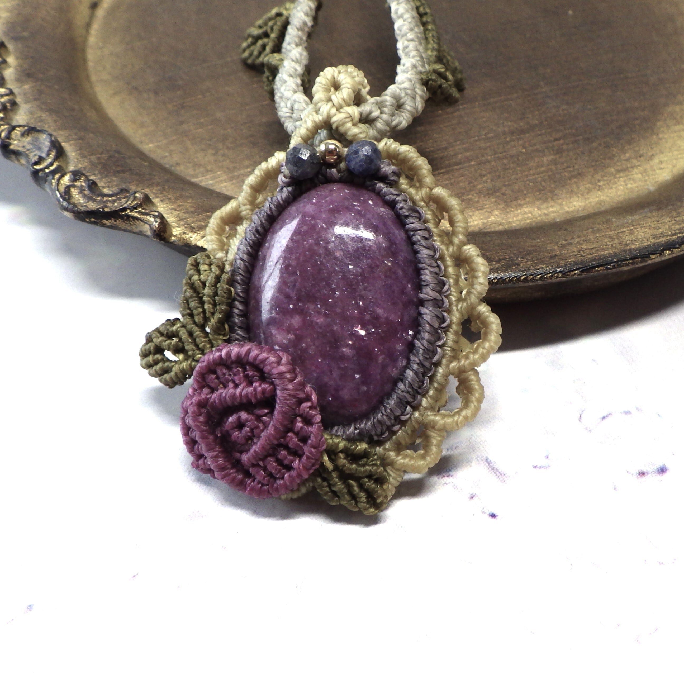 フレームにバラを一輪、中心の天然石(レピドライト)に添えて、エレガントなイメージのペンダントトップに編み上げました。