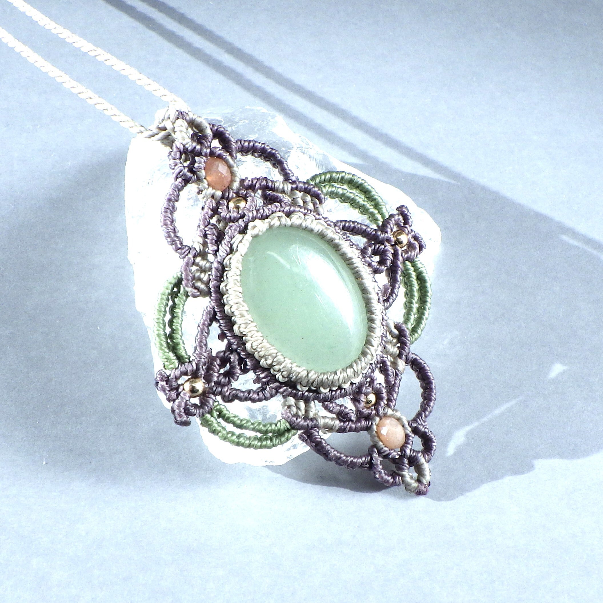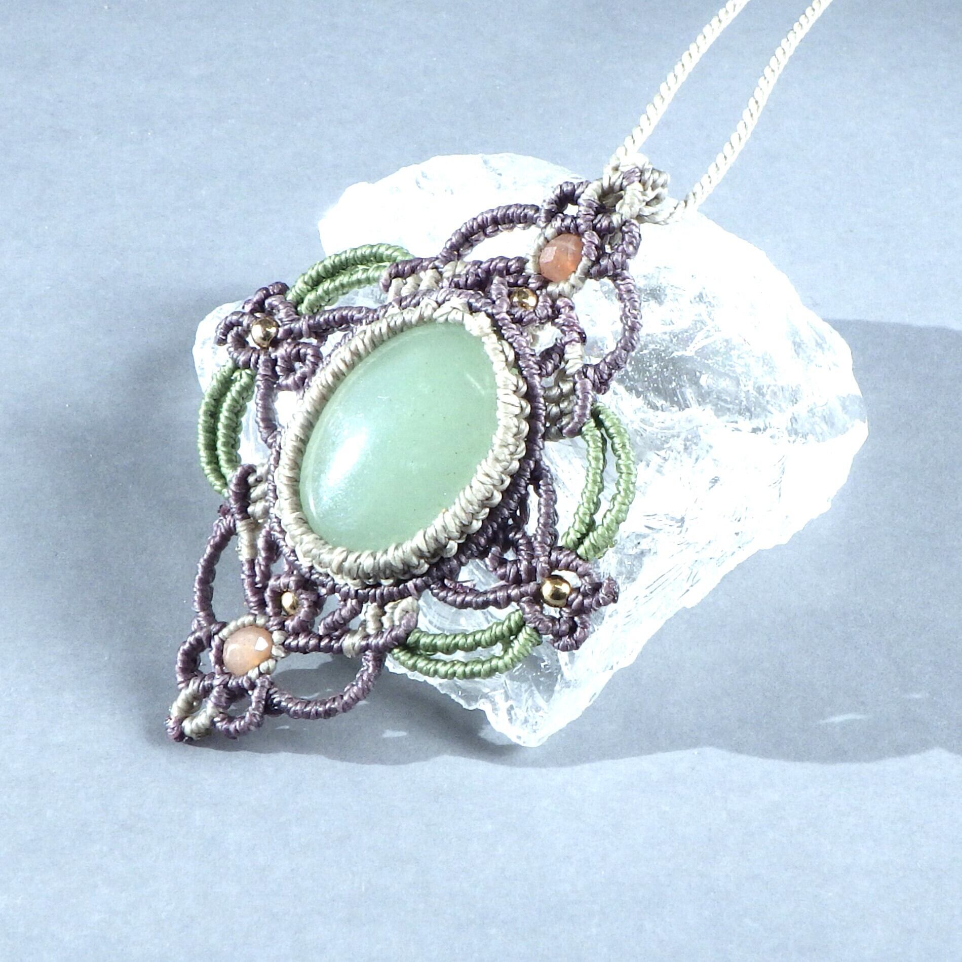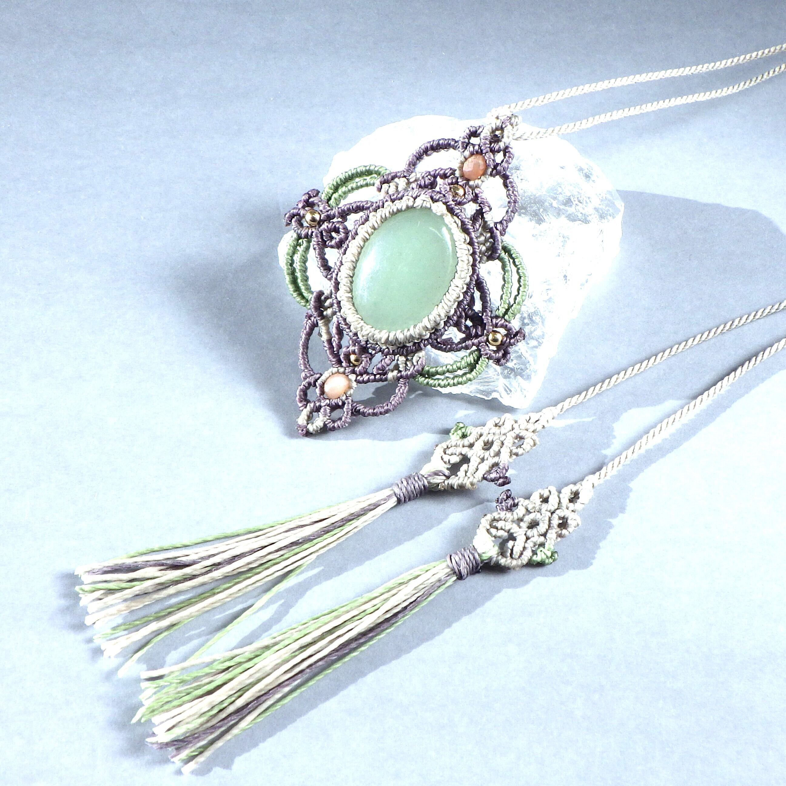 艶やかなグリーンアベンチュリンを3色のコードで装飾フレーミングしたペンダントネックレスです。
