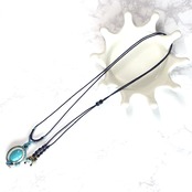 大空やきれいな海を思わせるターコイズカラーのカボションを2色の爽やかな色合いのコードでフレーミングしました。
