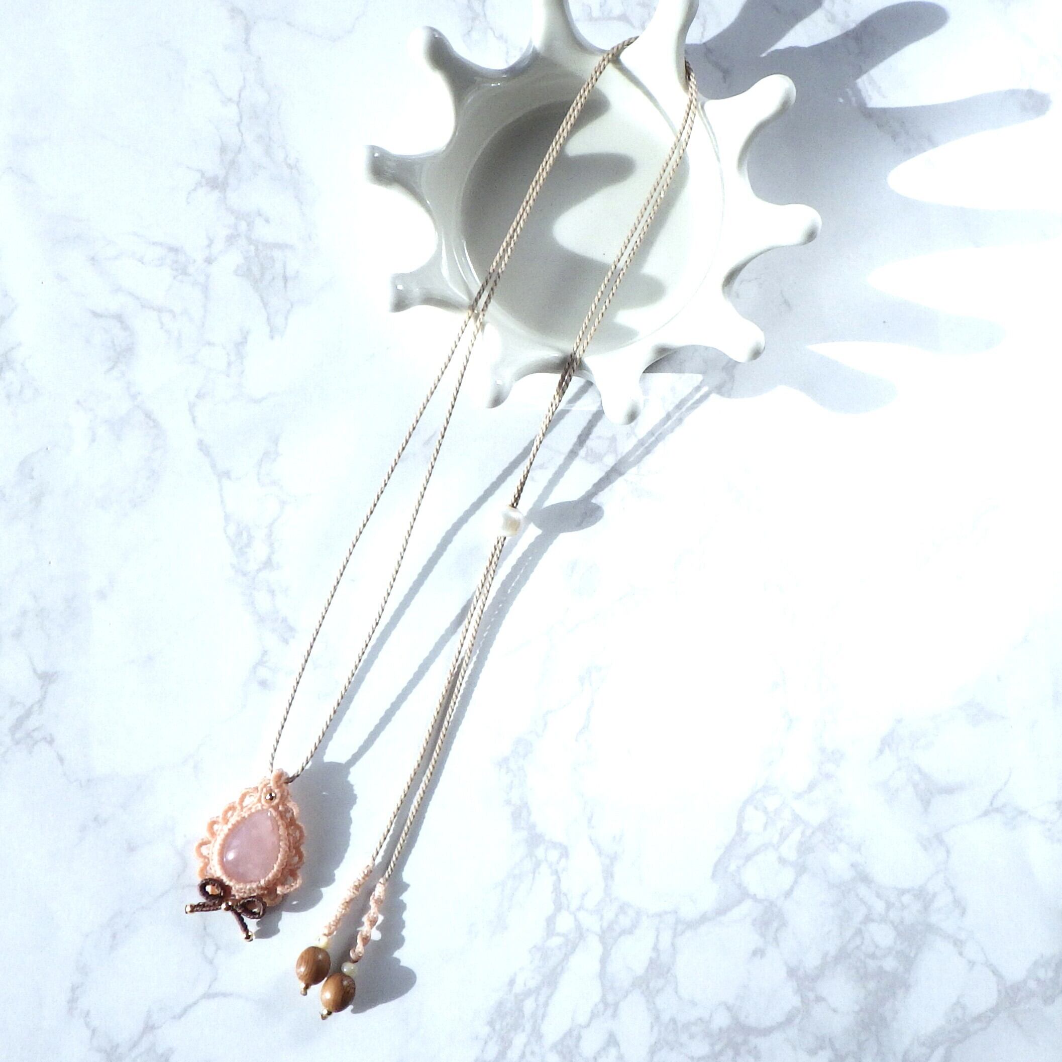 ローズクォーツの淡いピンク色に、優しい色合いの薄オレンジ色のコードを合わせ、レースのようなフレーミングをしました。