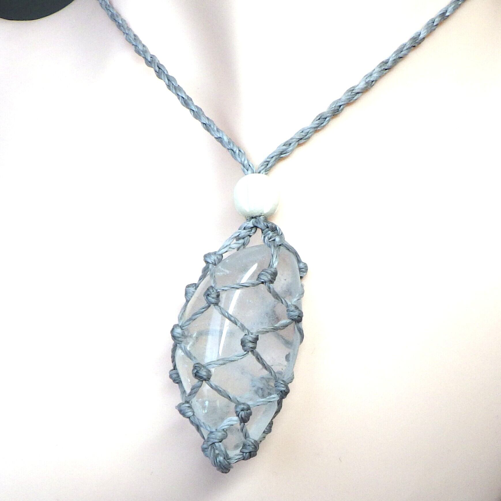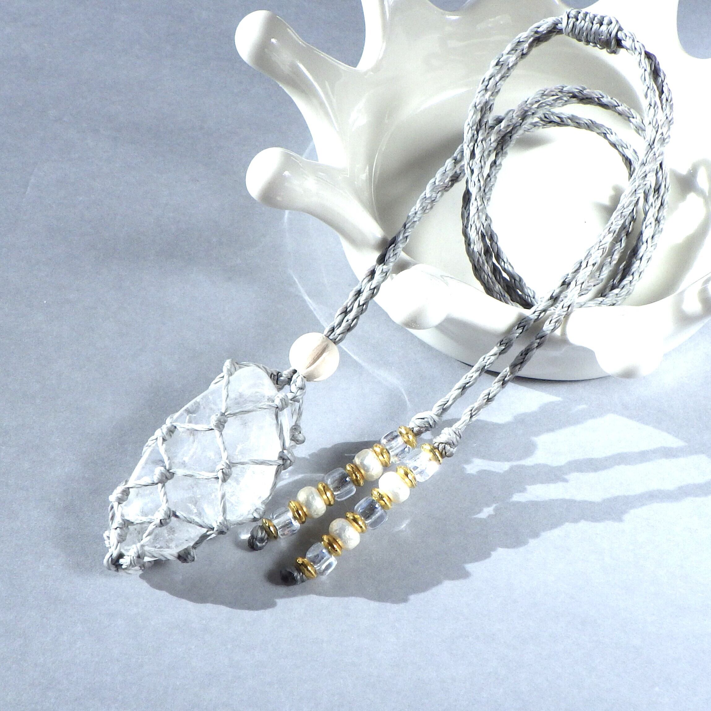 水晶をネット編みの袋に入れたナチュラルで可愛いペンダントネックレスです。